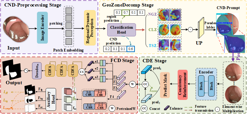 简介:变应性鼻炎(Allergic Rhinitis, AR)影响着全球超过5亿人口,亟需客观的影像学生物标志物以实现精准评估。作为AR的重要指标,清亮性鼻分泌物(CND)在鼻内镜图像中呈现出显著的视觉异质性与解剖学分布差异,使其分割任务极具挑战。这种困难主要源于复杂的光学伪影、柔性的解剖边界以及区域特异性的结构差异,严重制约了现有方法的性能。为此,本文提出了一种VRSegNet框架——一种基于视觉关系引导的分割方法,通过显式的解剖结构约束实现对CND的稳健定位。VRSegNet将鼻腔分解为三个功能区——中央腔隙区(CLZ)、鼻沟区(NGZ)和过渡沟区( TSZ),以适应结构和形态的变化。该框架结合视觉关系引导的对比学习(VR-CL)与动态区域感知融合机制,在复杂共现与模糊边界条件下有效区分分泌物与周围组织。基于 RhinoDynamix 数据集的大量实验表明,区域特异性分析显示分割结果与变应性鼻炎严重程度分级具有显著相关性,凸显了该框架在临床辅助评估中的潜在价值。